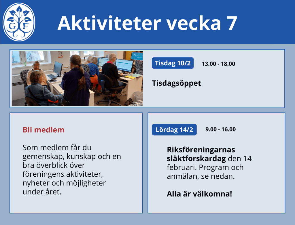 GFs 10:e släktforskarseminarium lördagen den 24 januari 2026.