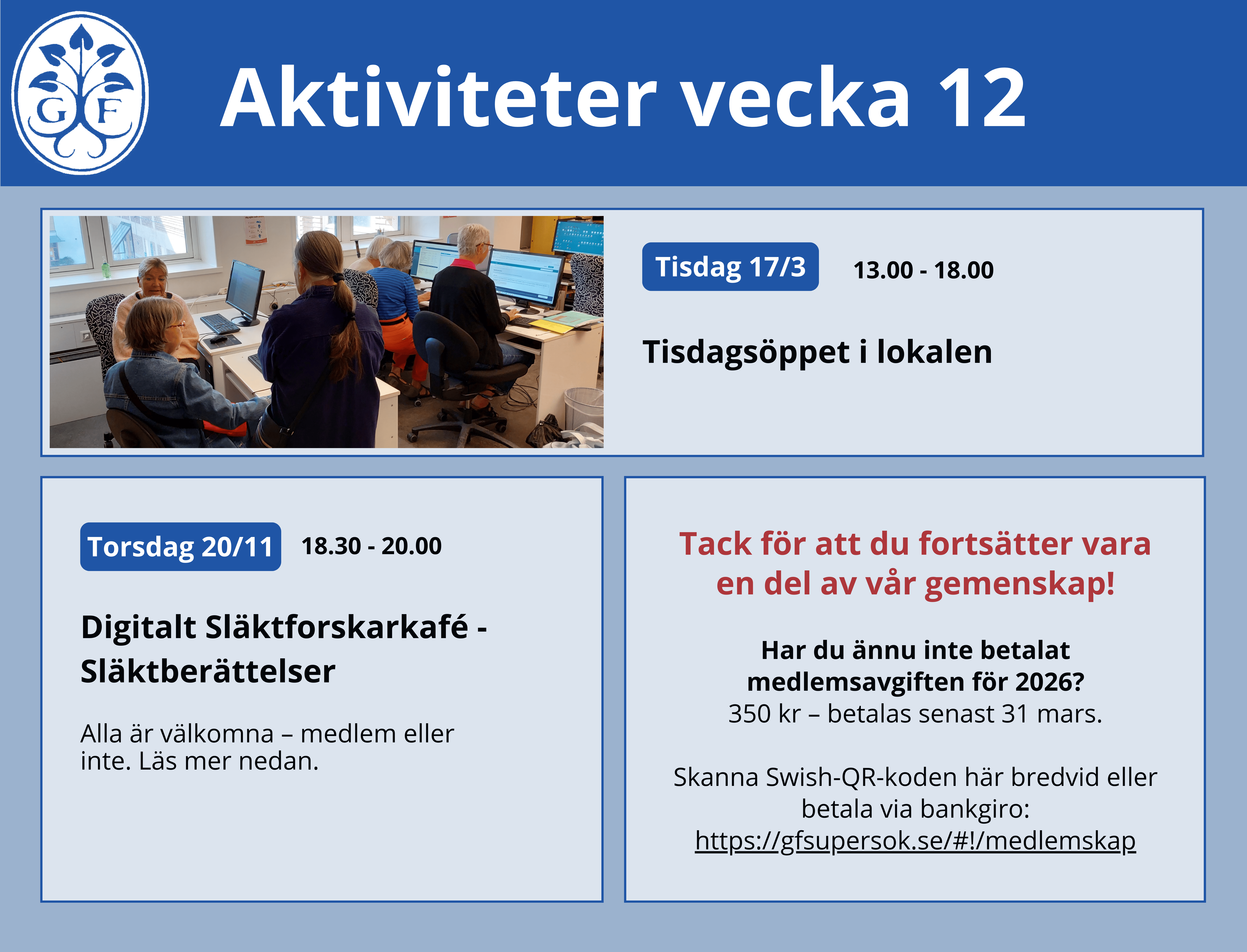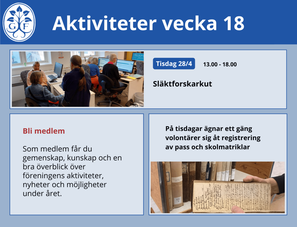 Här hittar du kommande föreläsningar, släktforskarkaféer och kurser arrangerade av Genealogiska Föreningen. Ta del av veckans program och utveckla din släktforskning tillsammans med oss.
