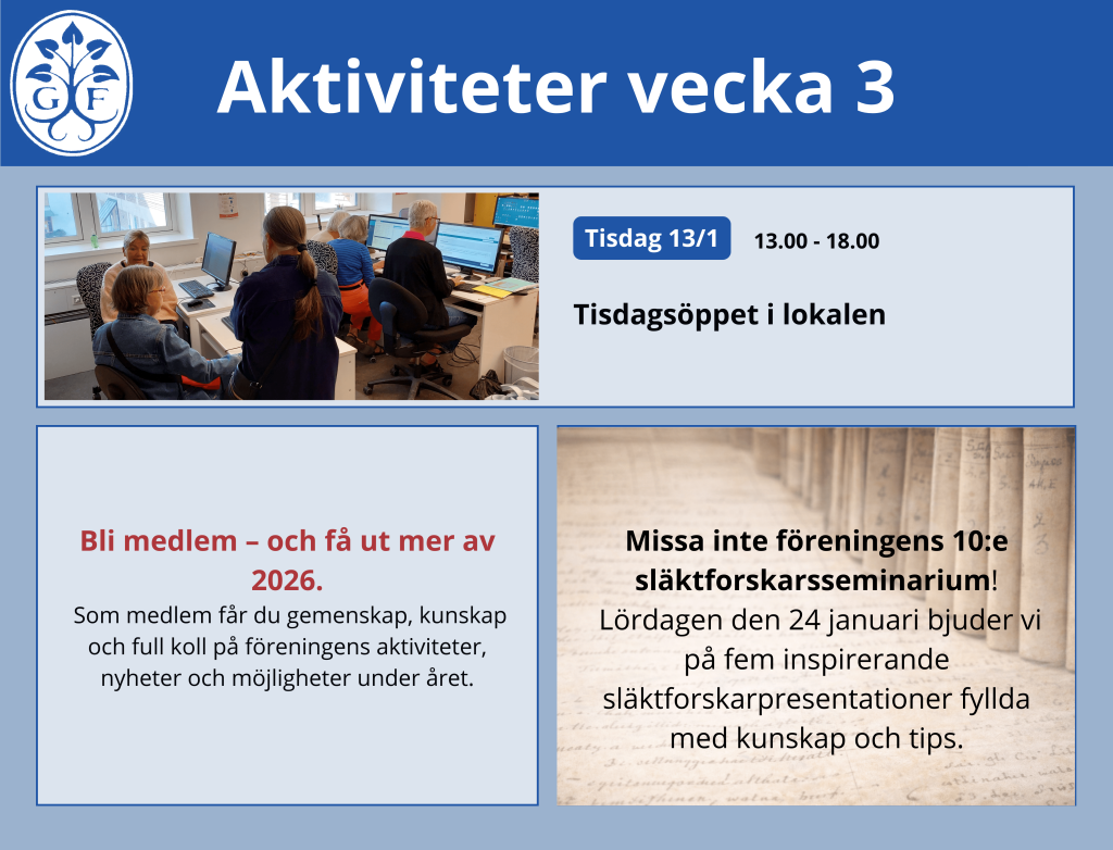 GFs 10:e släktforskarseminarium lördagen den 24 januari 2026.