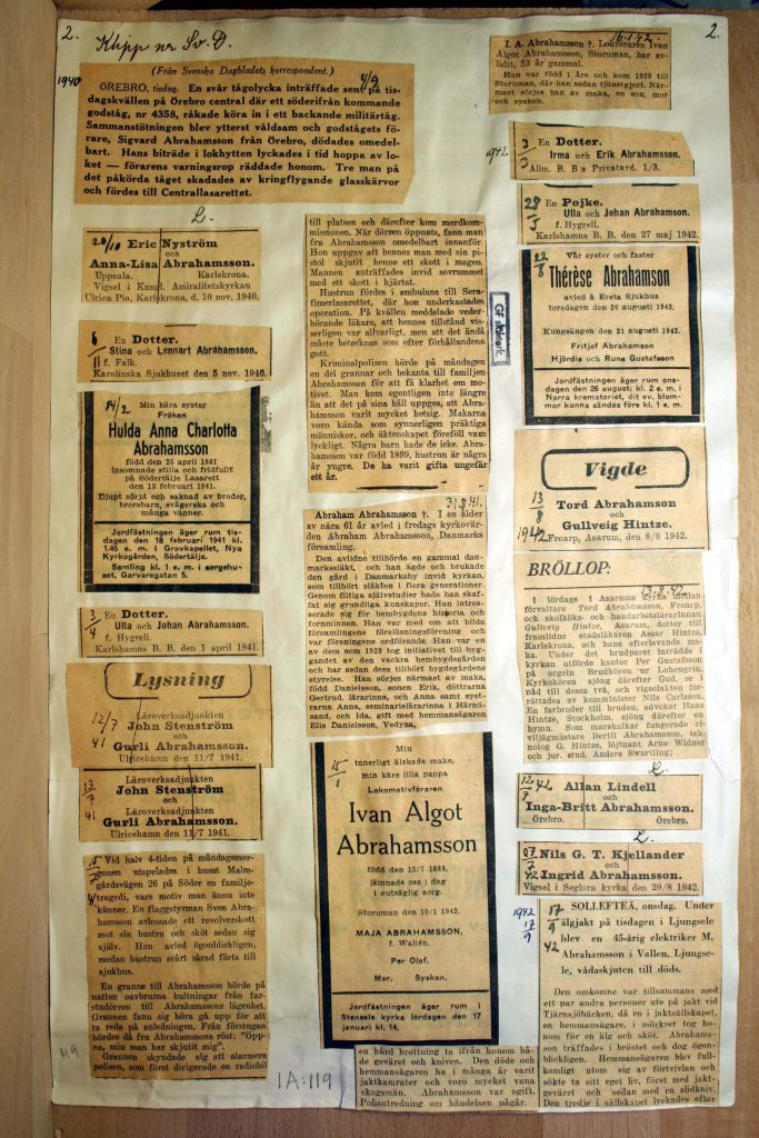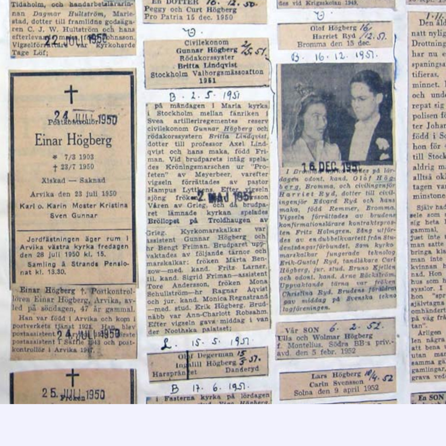 Projektet Familjenotiser startade 1937 genom att familjenotiser klipptes i Svenska Dagbladet. Senare har har Dagens Nyheter tillkommit från och med 1967 och Dalslänningen från och med 1960. Notiserna sträcker sig till 1999. Notiserna är monterade på drygt 200 000 folioblad och är idag skannade. Man kan idag söka på släktnamnet. Ett pågående projekt är att registrera alla individer som nämns i notiserna. Idag är 114031 sådana personposter registrerade. För att ta del av databasen måste du vara inloggad som medlem. => Läs mer.