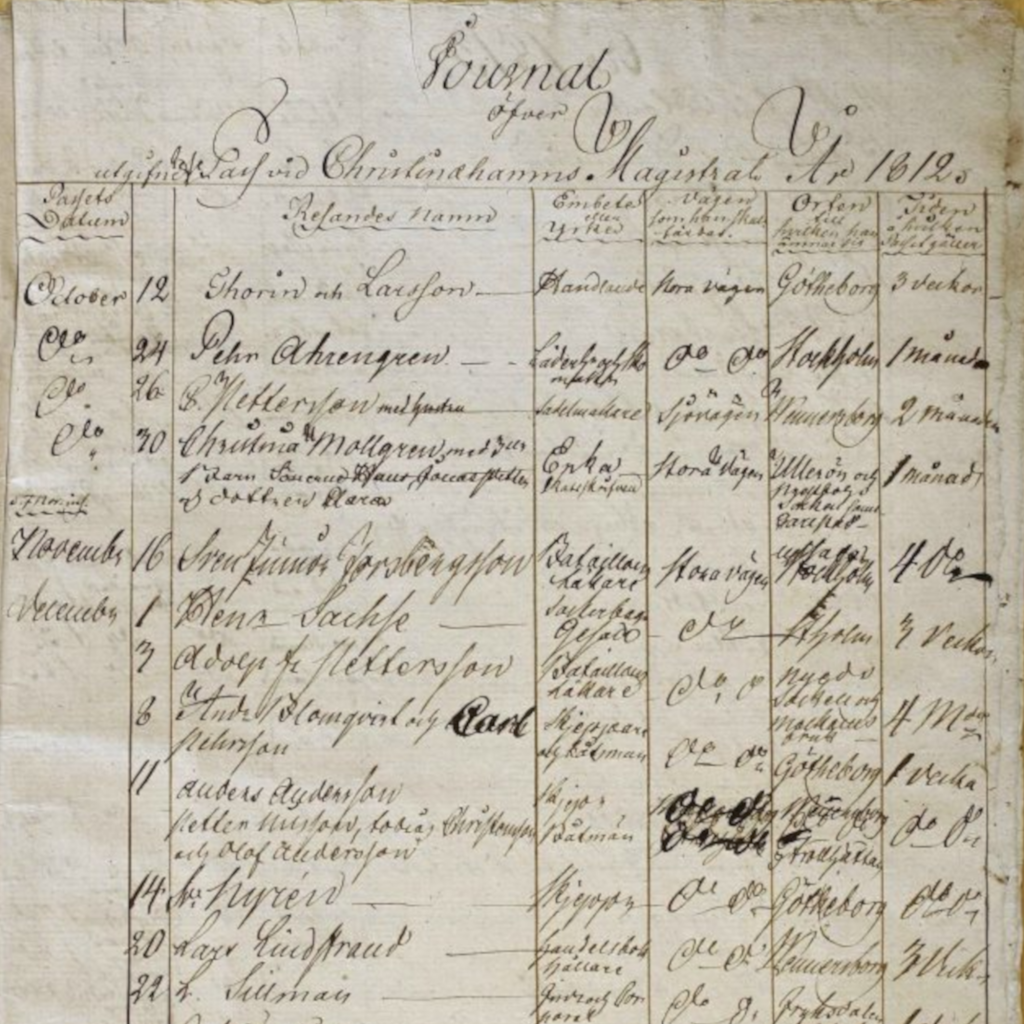 Sedan 2010 fotograferar och registrera Genealogiska Föreningen passjournaler för de pass som krävdes fram till 1860 för inrikes resor. Just nu innehåller databasen 715647 poster.