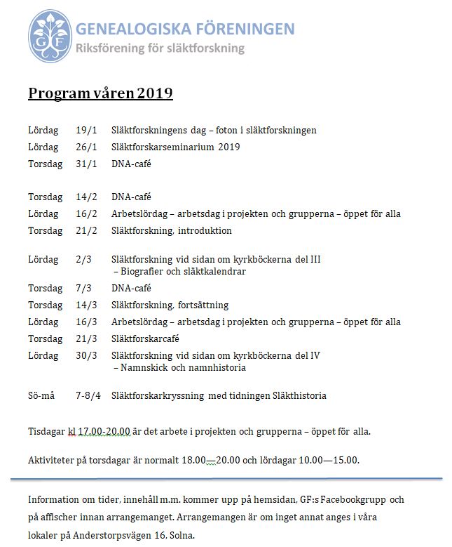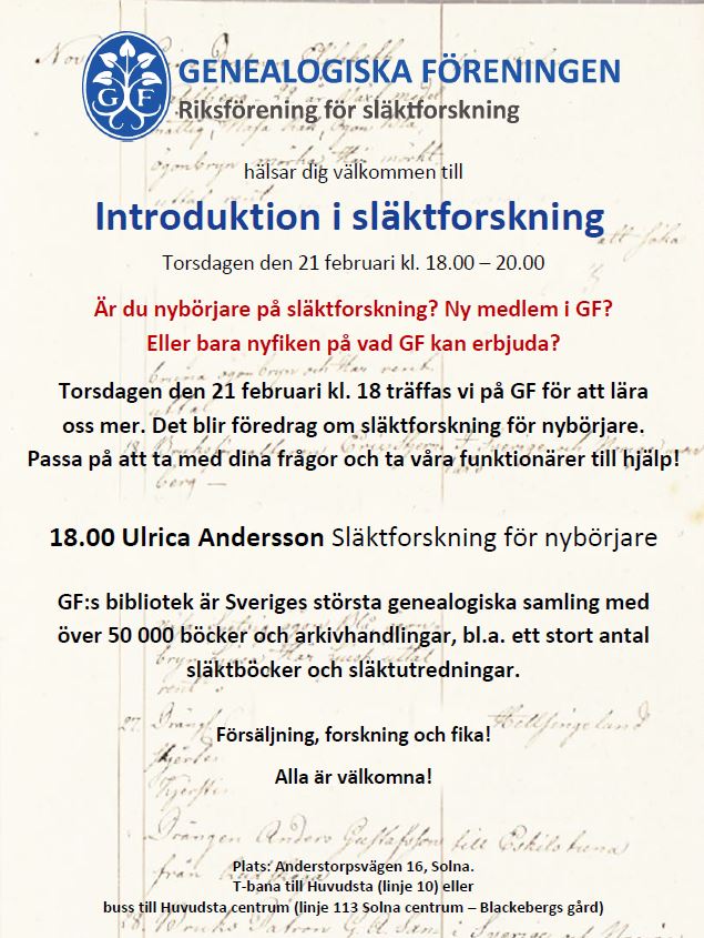 Vi ses i Genealogiska Föreningens lokaler i Huvudsta, Solna (Stockholm) på Anderstorpsvägen 16. Fika finns till självkostnadspris (20 kr).