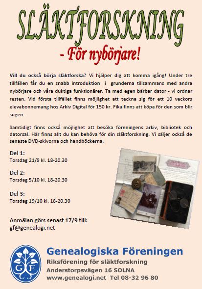 Samtidigt finns också möjlighet till att besöka GF:s arkiv, bibliotek och datorsal. Här finns allt du kan behöva för din släktforskning. Vi säljer också de senaste DVD-skivorna och handböckerna samt mycket annat du har användning för i din släktforskning.