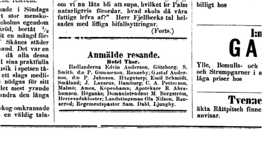 Anmälda resande tidningen Norra Skåne 1884Exempel på en tidningsnotis med ”Anmälde resande”, här från tidningen Norra Skåne den 17 juni 1884. Hotel Thor låg i Ängelholm.
