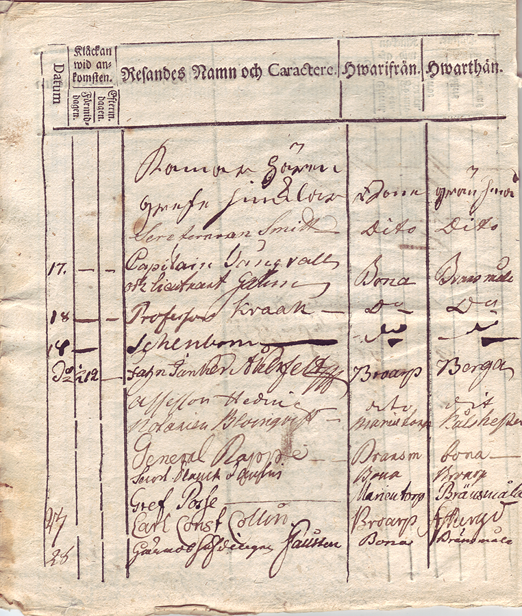 I vissa städer fördes förteckningar över resande, de personer som övernattade i staden. Dessa listor innehåller genomgående titel, namn, avreseort och destination, uppgift om passet och dessutom namngivet den person den resande logerade hos.