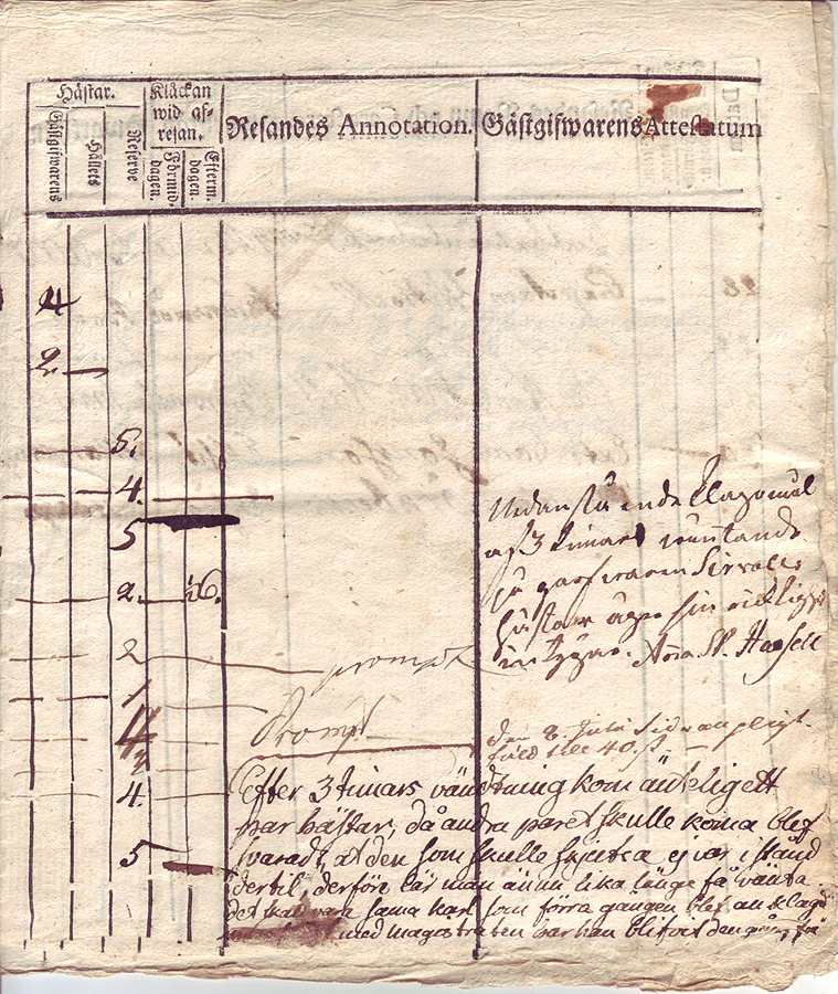 Dagbok_1782_sid6…och motstående sida ur samma handling, med gästernas kommentarer och klagomål.