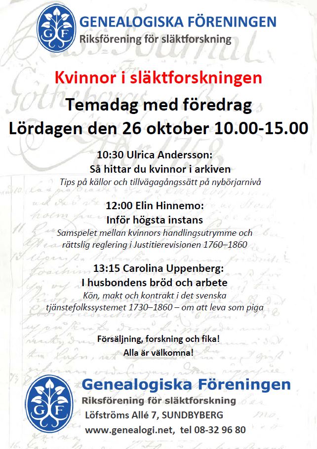 Temadag – Kvinnor i släktforskningen 26 oktober
