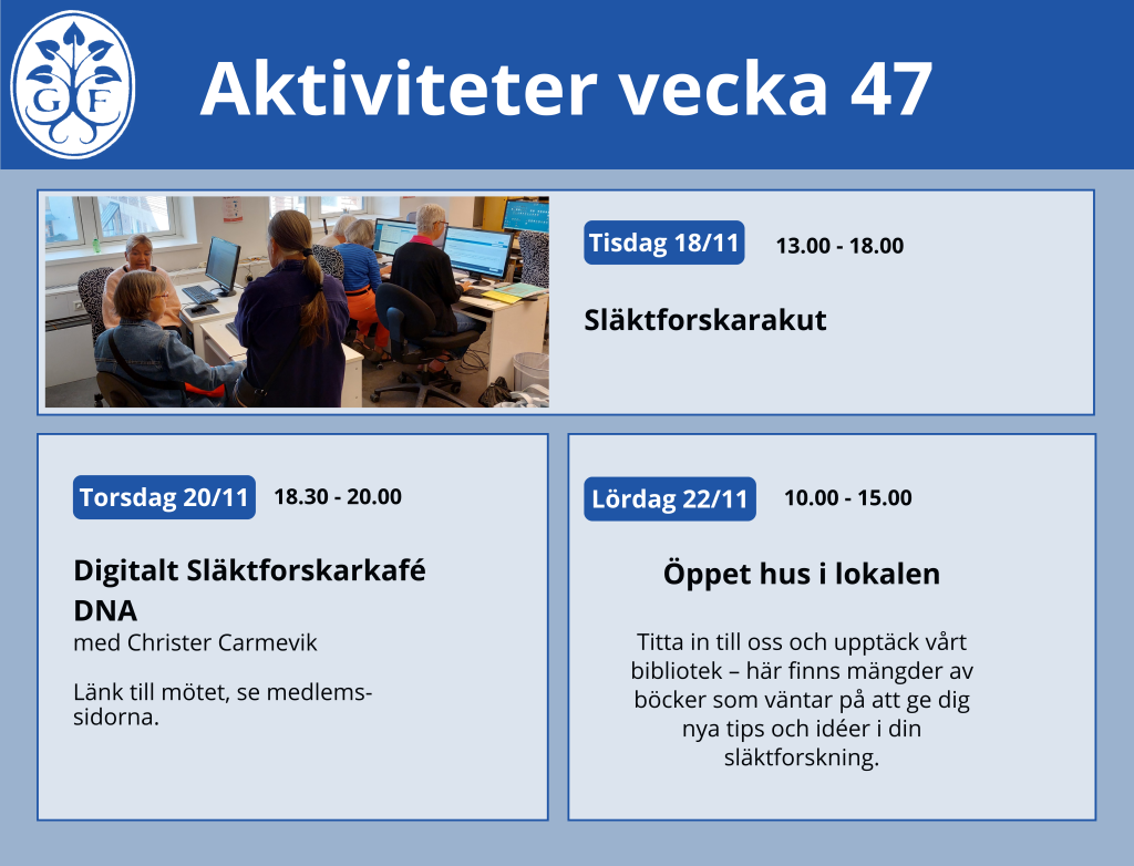 Här kan du ta upp frågor om DNA i släktforskning, dela erfarenheter och få tips från andra deltagare. Länk till Zoom finns på medlemssidorna